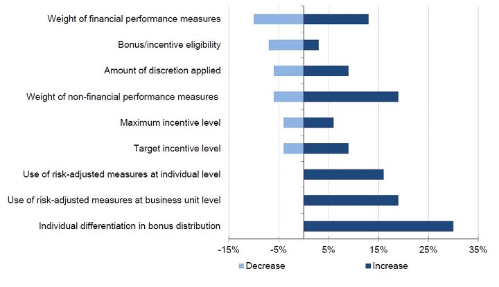 Die meisten Unternehmen des weltweiten Finanzsektors planen 2016 keine Veränderungen ihrer Incentive-Designs. 30 Prozent wollen eine stärkere individuelle Differenzierung ihrer Boni erreichen. 19 Prozent wollen das Gewicht nicht-finanzieller Leistungsparameter bei der Bestimmung der Bonushöhe erhöhen. Mehr als 15 Prozent der Finanzdienstleister planen eine stärkere Belohnung risikoangepassten Verhaltens auf Abteilungs- und Mitarbeiter-Ebene.