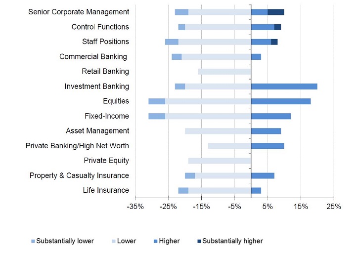 Sinkende Boni finden sich vor allem im Renten- und Börsenhandel (Positionen Fixed Income und Equities, 31 Prozent der Nennungen), während die variable Vergütung in Private Equity und im Retail Banking weitgehend gleich bleibt (81 Prozent und 84 Prozent der Nennungen).