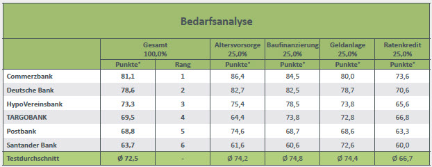Jeweils unter dem Durchschnitt der Beratungsqualität rangierten die Targobank, Postbank und Santander Bank.