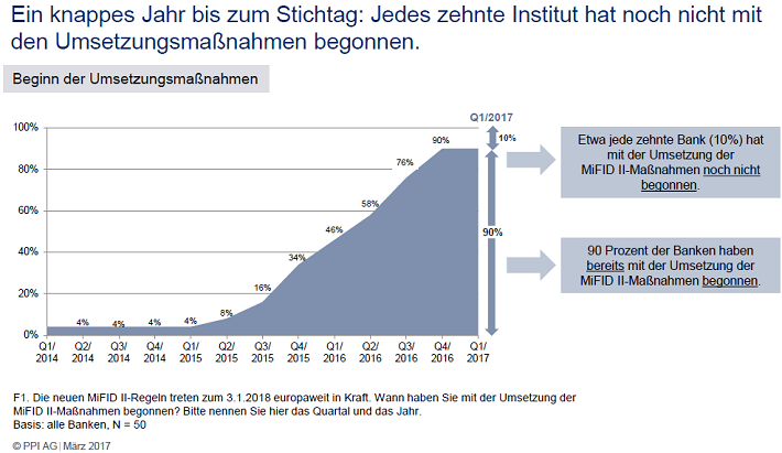 Im Januar 2018 tritt die MiFID-II-Richtlinie in Kraft. Den Banken in Deutschland bleibt also nur noch wenig Zeit, um sich darauf vorzubereiten. Eine aktuelle Studie zeigt: Viele Institute hängen hinter dem Zeitplan her. Lange To-Do-Listen mit unerledigten Punkten legen Planungsfehler offen.