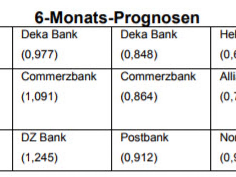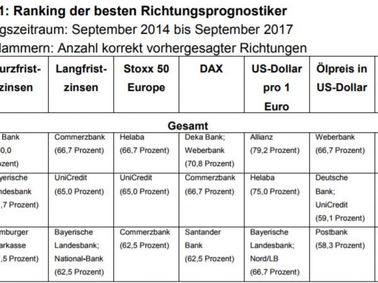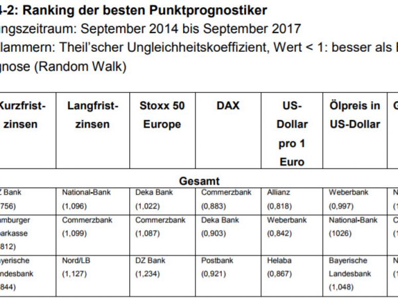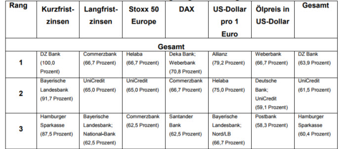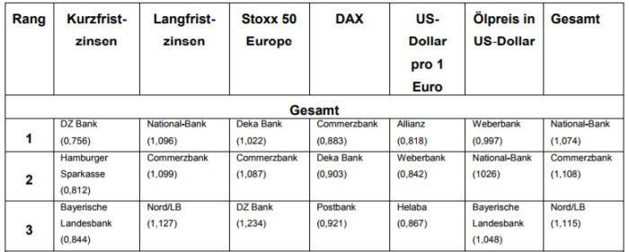 Im Frühjahr übernahm das Kölner Institut für Wirtschaftsforschung (IWK) die Durchführung des bekannten Prognosetests des Zentrums für Europäische Wirtschaftsforschung (ZEW). Unter der neuen Federführung nennt sich der Test nun IW Financial Expert Survey, die Methodik wurde nicht verändert. Das Institut überprüft über einen Zeitraum von drei Jahren die Prognosekraft der Finanzhäuser. In der Listung des Gesamtrankings werden nur Häuser geführt, die mindestens neun Prognosen in den letzten zwölf Quartalen der folgenden Indikatoren abgegeben haben: kurzfristige Zinsen, langfristige Zinsen, DAX, Stoxx 50 Europe, EUR/USD-Wechselkurs sowie der Ölpreis.