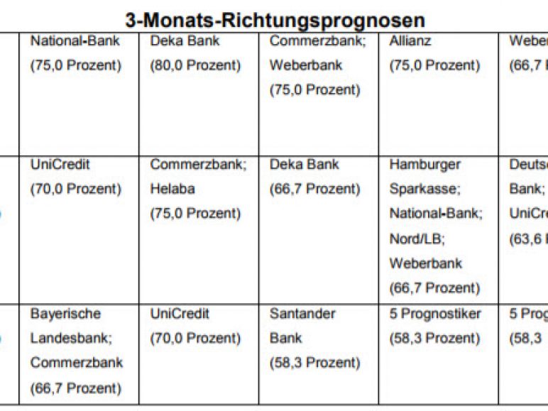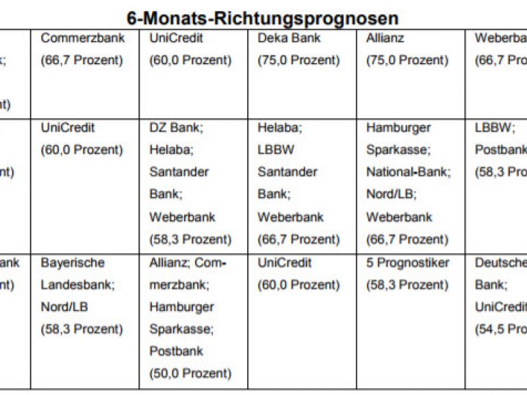Ihre Voraussagen der letzten drei Jahre über das gesamte Prognosespektrum hinweg trafen in 63,9% der Fälle ein. Insbesondere bei der Voraussage der Kurzfristzinsen glänzen die DZ-Experten mit einer makellosen Bilanz (100%), erzielen aber in den anderen Cases kein Top-Ranking. Auf Rang zwei der richtungssichersten Prognostiker kommt die Unicredit (61,5%). Paradedisziplin der Italiener war die Entwicklung der Langfristzinsen, die des Ölpreises sowie die Kursfahrt des Euro Stoxx 50. Rang drei erzielte wie im Vorquartalsranking die Hamburger Sparkasse (60,4%).