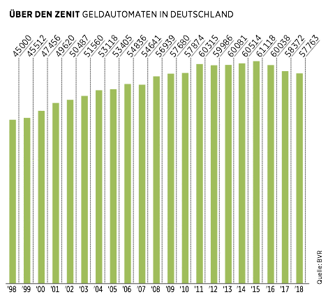 Demnach sank die Zahl der Automaten im Jahr 2018 um ein Prozent auf 57 763 Stück. Zwar schwächte sich der Rückgang zuletzt etwas ab — 2016 lag der Schwund demnach bei 1,8 Prozent, 2017 sogar bei 2,8 Prozent —, doch es bleibt bei der negativen Tendenz. Die Daten unterscheiden sich etwas von der Statistik der Deutschen Bundesbank, die für 2017 mit 57 967 etwas weniger Geldautomaten auswies als Barkow. Die Bundesbank hat für 2018 noch keine Zahlen dazu vorgelegt.