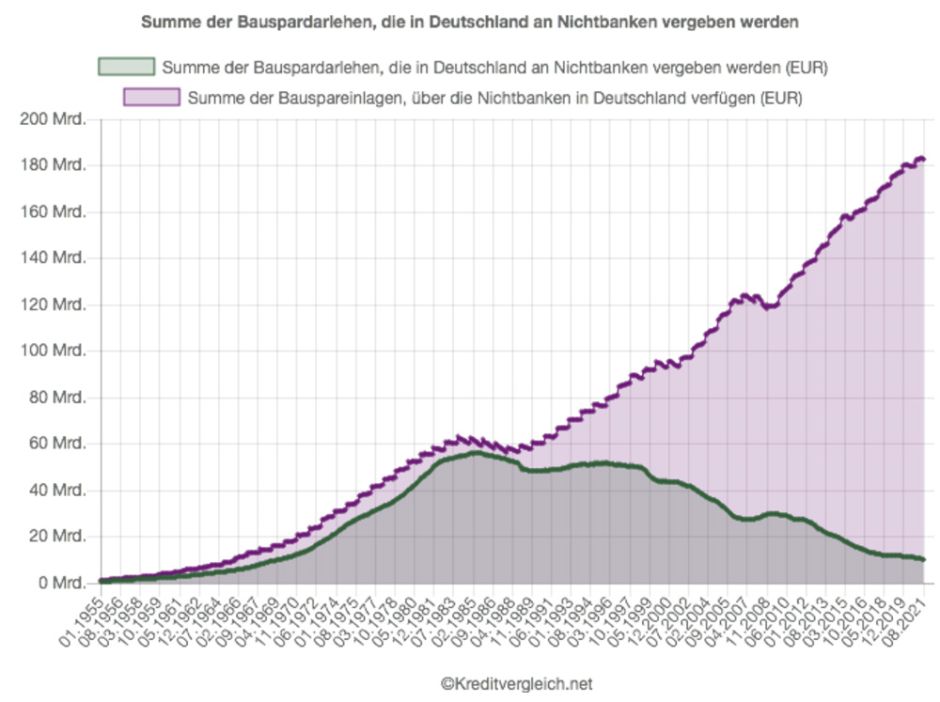 Von 2013 bis 2021 ging die Anzahl der neuabgeschlossenen Bausparverträge von 3,3 Millionen auf 1,2 Millionen zurück. Der Höhepunkt bestehender Verträge war 1999 erreicht, als die Deutschen insgesamt 34 Millionen Bausparverträge hatten.
