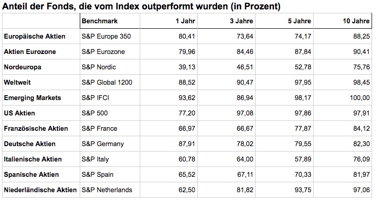 Wie die Tabelle zeigt, waren Fonds mit Anlageschwerpunkt italienische Aktien im Schnitt am erfolgreichsten: Hier konnten vierzig Prozent der Fonds am Ende des vergangenen Jahres den Index schlagen, während nur sieben Prozent der Emerging-Market-Fonds besser waren als die Benchmark.
