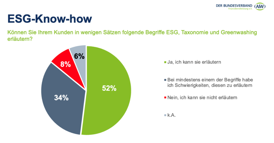 ESG, Taxonomie und Greenwashing sind nur einige der wesentlichen Begriffe, die Vermittlerinnen und Vermittler in der Kundenberatung zu nachhaltigen Versicherungsprodukten und Kapitalanlagen kennen sollten. Jeder zweite Vermittelnde (52 Prozent) hat kein Problem, diese Begriffe den Kunden zu erklären.
