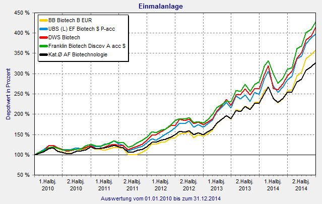 Der Boom des Sektors lässt sich auch an der Entwicklung der Biotech-Aktienfonds ablesen. Im zu Ende gegangenen Jahr 2014 steigerten diese Produkte ihren Wert im Durschnitt um 43,2 Prozent. Einzig indische Aktienfonds zeigten eine bessere Performance. Im Vergleich zum Ausnahmejahr 2013, das Biotech-Fonds mit einem Plus von 52,7 Prozent beendeten, schnitten sie allerdings etwas schlechter ab. Das ist jedoch kein Grund zur Klage, der Trend bleibt positiv: 2010 erreichte die Peergroup ein Plus von 19,4 Produkt, im Krisenjahr 2011 waren es immerhin noch 0,5 Prozent. 2012 endete mit einer Wertentwicklung von knapp 25 Prozent. Fünf positive Jahre in Folge muss eine Peergroup erstmal schaffen.