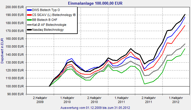 Alle drei Biotechnologie-Fonds performen auf hohem Niveau. Platz eins und drei trennen im Jahr 2012 bisher lediglich 0,78 Prozent. Dass alle der verglichenen Fonds an die zwei zuletzt starken Jahre anknüpfen können, deutet darauf hin, dass der Boom dieser Branche noch nicht vorbei ist.