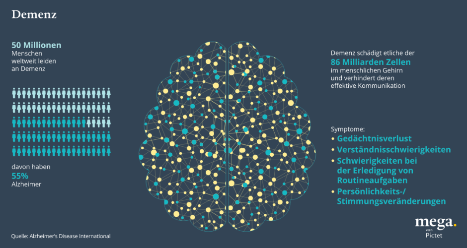 Rund 55 Prozent der weltweit über 50 Millionen Demenzkranken leiden unter der Alzheimer-Krankheit1 – eine Zahl, die mit der Alterung der Bevölkerung weiter steigen wird. Nicht nur die Patienten leiden unter der Krankheit, auch für Millionen Familienangehörige und unbezahlte Pflegende, die im Jahr 2020 15,3 Milliarden Pflegestunden im Wert von 256,7 Mrd. US-Dollar für Menschen mit Alzheimer und Demenz geleistet haben, ist sie eine grosse Bürde.2 Trotz der weiten Verbreitung und der Kosten hat die Pharmaindustrie seit über hundert Jahren keine Fortschritte bei der Behandlung der Erkrankung gemacht, während für andere neurologische Krankheitsbilder Lösungen gefunden wurden.