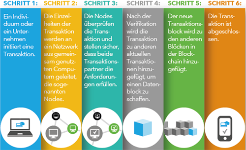 Die Bitcoin ist aber die erste Anwendung der Blockchain, einer Technologie, die digitale Konten ermöglicht, auf die über öffentliche oder private Netzwerke zugegriffen werden kann, um Transaktionen nachverfolgen zu können. Diese Konten erfassen Transaktionen, werden von den Teilnehmern des Netzwerks genehmigt und als Datenblöcke geführt. Wenn dann immer mehr Datenblöcke zusammenkommen, werden sie sicher mit älteren Transaktionen verkettet. Diese Datenketten können dann ausgetauscht und von den Handelspartnern zusammengeführt werden.