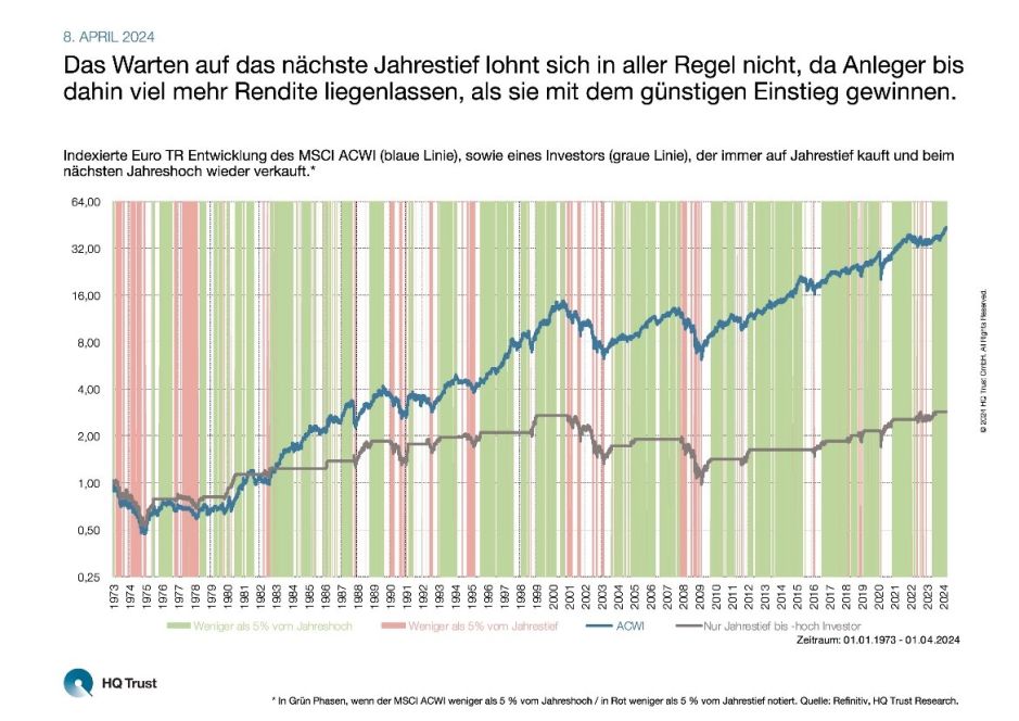 · „Das Warten auf das nächste Jahrestief lohnt sich in aller Regel nicht, da Anleger bis dahin viel mehr Rendite liegenlassen, als sie nach dem günstigeren Einstieg gewinnen können.“