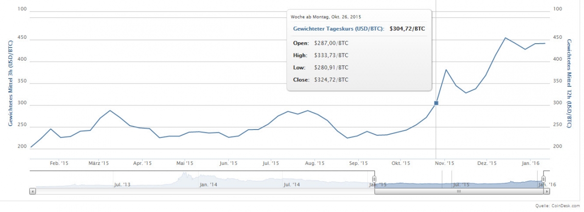 „Als im Sommer die Kurse an der chinesischen Festlandbörse in Shanghai einbrachen, flüchteten Chinesen in den Bitcoin“, berichtet die Wirtschaftswoche. Damit scheinen Bitcoins in China Gold als Krisenwährung abgelöst zu haben. Zum Jahresende 2015 sei das Handelsvolumen der Kryptowährung in China dann ein zweites Mal explodiert. Befand sich die Binärziffermünze vor kurzem noch in einer Krise, so scheint sie nun wieder Fuß zu fassen. Gegen Ende 2013 stieg der Wert eines Bitcoins von etwa 60 auf rund 1200 US-Dollar, dann rutschte der Kurs wieder unter 350 US-Dollar. Im August 2015 notierte die um die 250 US-Dollar. Heute liegt der Kurs wieder deutlich über 400 US-Dollar.