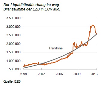Dazu ist wichtig – zweitens –, dass der Rückgang der Liquidität keine restriktive geldpolitische Maßnahme ist. Er ist Resultat einer Marktentwicklung. Die Banken zahlen Kredite an die EZB zurück, die sie im Rahmen der Longer Term Refinancing Operation (LTRO) Ende 2011/Anfang 2012 aufgenommen hatten. Die Notenbank hat an der Rückzahlung kein Interesse. Ich vermute sogar, es wäre ihr lieber, wenn die Banken die Gelder behalten und sie für zusätzliche Kredite (vielleicht auch Wertpapierkäufe) verwenden würden.