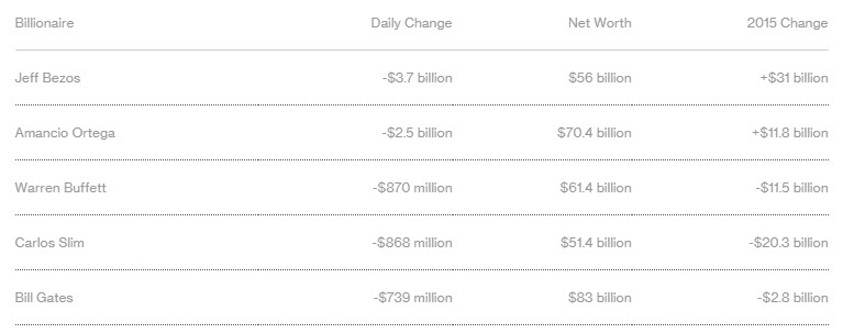 Jeff Bezos, Gründer von Amazon.com.Inc, verliert am ersten Handelstag 2016 3,7 Milliarden US-Dollar. Bezos Nettovermögen beläuft sich nun auf 56 Milliarden US-Dollar. Das Vermögen von Amancio Ortega sinkt um 2,5 Milliarden US-Dollar auf 70,4 Milliarden US-Dollar. Der Aktienkurs seines Unternehmens Inditex SA fällt am gestrigen Tag um 3,5 Prozent. CEO von Berkshire Hathaway Inc., Warren Buffett, Carlos Slim, und Bill Gates, die drei reichsten Menschen der Erde, verlieren zusammen 2,5 Milliarden US-Dollar.
