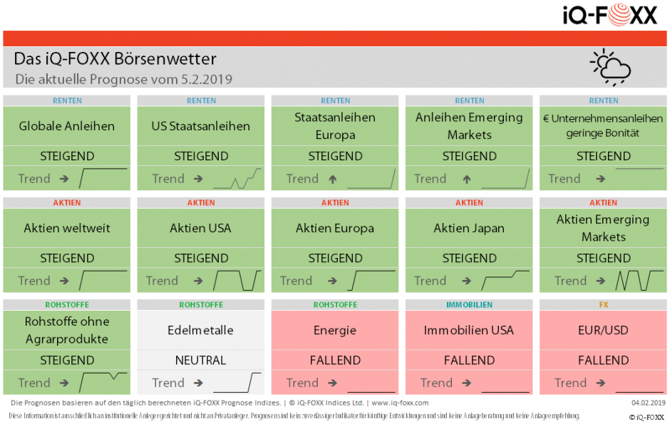 Das iQ-FOXX Börsenwetter basiert auf den täglich berechneten Prognose-Indizes von iQ-FOXX. Die Signale können zur Steuerung der Investitionsquote einzelner Märkte verwendet werden.