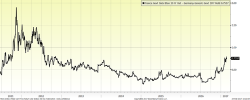 Ende April sind dann die Franzosen aufgerufen, einen neuen Präsidenten zu wählen. Auch hier schwanken die Umfragen, deuten aber gleichzeitig darauf hin, dass der rechtspopulistische Front National unter Marine Le Pen die erste Runde für sich entscheiden wird. Bislang werden die Kampagnen einiger Kandidaten, unter anderem von Le Pen, von Streitigkeiten überschattet. Da im zweiten Wahlgang eine Stichwahl erforderlich ist, scheint ein Wahlsieg Le Pens unwahrscheinlich. Dennoch wächst in letzter Zeit die Sorge an den Märkten, wie die Ausweitung des Renditeabstands zwischen französischen und deutschen Anleihen belegt.