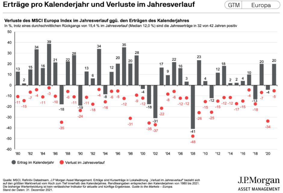 In jedem Jahr gebe es unruhige Phasen. In den meisten Jahren seien zwischenzeitliche Kursrückgänge im zweistelligen Prozentbereich nichts Ungewöhnliches. Anleger sollten davon nicht überrascht sein. Oftmals hätten sich Schwächephasen am Aktienmarkt als Chance dargestellt. Gerade Aktien böten die aussichtsreichsten Chancen.