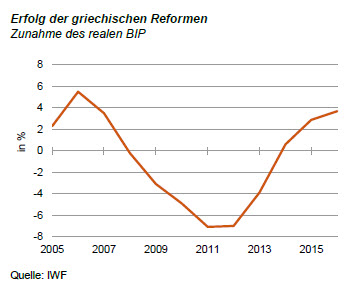 Erstens: Es wird immer wieder gesagt, Griechenland sei ein Fass ohne Boden. Da sollte man nicht gutes Geld schlechtem hinterherwerfen. Das ist nicht richtig. Ökonomisch steht Griechenland nach den schmerzhaften Anpassungsprozessen der letzten Jahre heute besser da denn je. Die Wirtschaft wächst wieder (siehe Grafik). Die Leistungsbilanz weist einen Überschuss auf. Das Haus-haltsdefizit ist kleiner als 3 %. Italien und Frankreich wä-ren glücklich, wenn sie eine solche Bilanz aufzuweisen hätten.