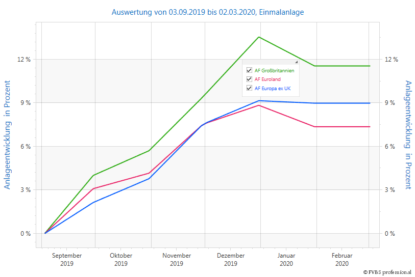 Auch 2019 zeigten britische Aktien im Vergleich zu Europa Stärke. Und seit sich immer deutlicher abzeichnete, dass die Insel nun endgültig die Europäische Union verlassen wird, herrscht sogar Aufbruchsstimmung. Davon konnten Anleger, die in Brit-Fonds investiert sind, deutlich profitieren, wie eine Analyse mit der Investment-Software FVBS professional zeigt: Während Fonds, die in britische Aktien investieren, in den vergangenen sechs Monaten bis Ende Februar 2020 im Durchschnitt 11,56 Prozent an Wert zulegten, gewannen Europa-Fonds ohne britische Aktien im Schnitt nur neun Prozent an Wert. Die Outperformance britischer gegenüber Euroland-Fonds ist noch deutlicher: Mit einer kumulierten durchschnittlichen 6-Monats-Performance von 7,36 Prozent können sich Fonds mit Aktien aus den Euroländern mit den Brit-Fonds nicht messen.