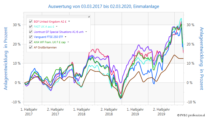 Wie sehr sich die verschiedenen Brit-Fonds in den vergangenen drei Jahren bis zum Corona-Crash in der vergangenen Woche entwickelt haben, macht ein Chartvergleich der fünf Top-Performer deutlich: