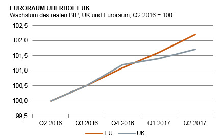 Schauen wir uns das genauer an. Konjunkturell sieht es in der EU gut aus. Das Wachstum ist hoch. Die EU hat Großbritannien seit Anfang des Jahres bei der Zunahme des realen BIP überholt (siehe Grafik). Interessant ist, dass selbst die europäischen Exporte nach Großbritannien trotz des ungünstigeren Wechselkurses und trotz der langsameren Expansion seines Binnenmarkts nicht stärker zurückgehen. Das zeigt, dass das Vereinigte Königreich viele Güter, die es braucht, gar nicht mehr selbst produziert und sie daher in jedem Fall importieren muss.