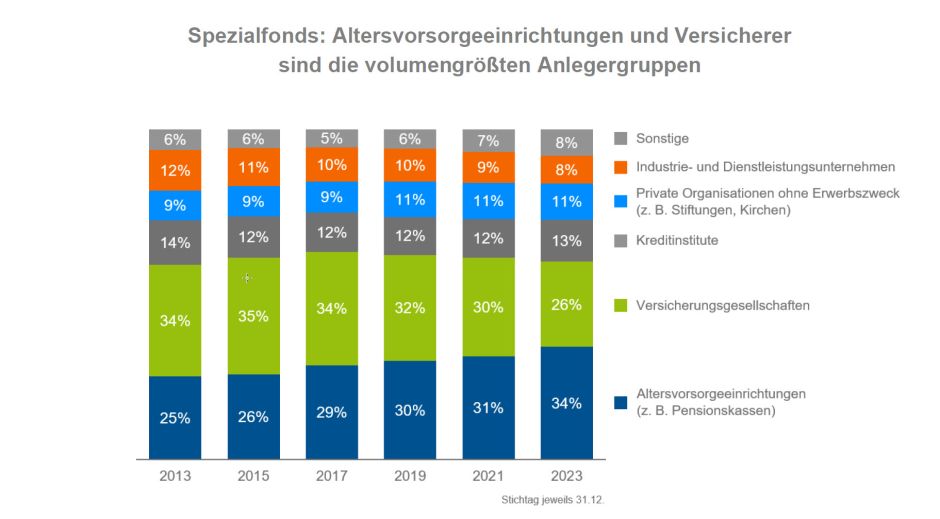 Beim verwalteten Vermögen sind Altersvorsorgeeinrichtungen mit 716 Milliarden Euro die größte Gruppe. Dazu gehören zum Beispiel berufliche Versorgungswerke. Versicherungsgesellschaften haben 541 Milliarden Euro in Spezialfonds angelegt. Auf beide Gruppen zusammen entfallen 60 Prozent des Gesamtvermögens. Aus diesen Zahlen wird einmal mehr deutlich, dass die Assetmanagement-Branche einen hohen Stellenwert bei der Altersvorsorge in Deutschland hat. (pg)