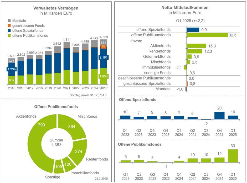 Fondsgesellschaften flossen im ersten Quartal netto 42,2 Milliarden Euro neue Gelder zu. Davon entfallen 32,5 Milliarden Euro auf offene Publikumsfonds, 9,9 auf offene Spezialfonds und 0,8 Milliarden Euro auf geschlossene Fonds. Aus Mandaten zogen Anleger 1,0 Milliarde Euro ab. Das Neugeschäft der Publikumsfonds dominieren ETFs mit 20,5 Milliarden Euro. Bei den Anlageklassen liegen Aktienfonds mit 15,3 Milliarden Euro vorn. Davon stammen 15,8 Milliarden Euro von Aktien-ETFs, aus aktiv gemanagten Aktienfonds flossen 0,5 Milliarden Euro ab. Rentenfonds verzeichneten ins-gesamt 12,3 Milliarden Euro neue Gelder. Davon entfallen 4,4 Milliarden Euro auf Renten-ETFs. Mischfonds, die von Mitte 2022 bis Ende 2024 Abflüsse verbucht haben, erhielten in den ersten drei Monaten 2,5 Milliarden Euro. Aus Immobilienfonds zogen Anleger netto 2,1 Milliarden Euro ab.