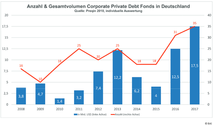 Mittelständler haben in Deutschland derzeit die Auswahl unter rund 35 reinen Unternehmenskreditfonds, die laut Preqin-Daten im Jahr 2017 über ein Gesamtvolumen von ca. 17,5 Milliarden US-Dollar verfügten und im deutschen Mittelstand vor allem Wachstums- und Übernahmefinanzierungen bereitstellen. Diese Unternehmen liegen überwiegend im oberen Sub-Investment-Grade-Bereich und erzielen einen Umsatz zwischen fünf und 25 und 75 Millionen Euro. Die von den Kreditfonds bereitgestellten Kredite weisen mit fünf bis 100 Millionen Euro eine große Spreizung auf.