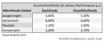 Die geringsten Performance-Unterschiede zwischen Dach- und Einzeltitelfonds zeigen die Fonds der Peergroup „Mischfonds Global dynamisch“. Hier ist nur ein geringer Unterschied messbar – aber auch hier liegen die Einzeltitelfonds vorn. Sowohl Dach- als auch Einzeltitelfonds kommen im Durchschnitt auf 6,6% per annum in den vergangenen zehn Jahren.