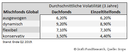 Wenn schon nicht bei der Performance, so könnten Dachfonds ja wenigstens mit einer geringeren Volatilität punkten. Doch die Volatilitäts-Unterschiede zwischen Dach- und Einzeltitelfonds sind nur gering. In zwei der vier betrachteten Peergroups liegen die Einzeltitelfonds sogar leicht vorn. Das bedeutet, sie weisen im Durchschnitt eine geringere Volatilität auf. Lediglich in der Peergroup „Mischfonds Global konservativ“ – die Mischfonds mit risikoarmen Profilen zusammenfasst – zeigen Dachfonds mit durchschnittlich 3,5% eine spürbar geringere Volatilität als Einzeltitelfonds mit 4,4%.