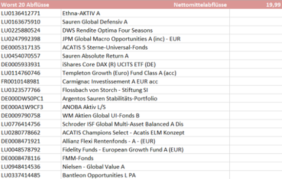 Den stärksten Absatzrückgang verbuchen die Hamburger beim Mischfonds Ethenea Ethna-Aktiv A (ISIN: LU0136412771). Ebenfalls Nettoabflüsse verzeichnete die Netfonds AG beim Dachfonds Sauren Global Defensiv A (ISIN: LU0163675910) von IPConcept. Auch aus dem Rentenfonds DWS Rendite Optima Four Seasons (ISIN: LU0225880524) flossen Mittel ab.