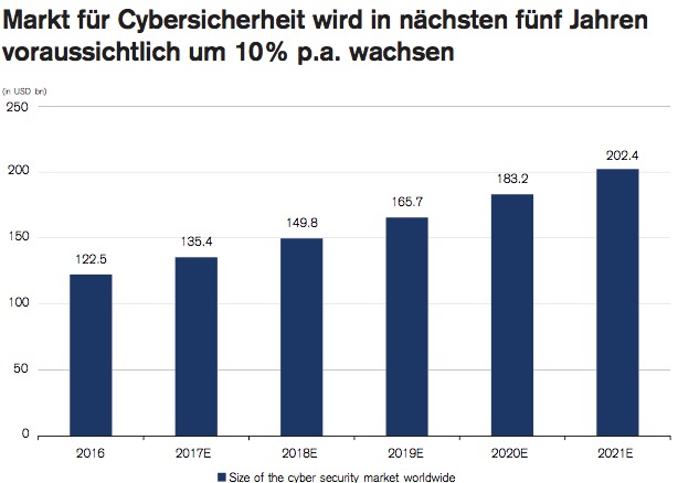 Die globale Cyberattacke der letzten Woche machte einmal mehr deutlich, welchen Herausforderungen wir in einer zunehmend digitalisierten, auf Superkonnektivität basierenden Welt gegenüberstehen. Internetsicherheit ist eines der Themen, das wir im Rahmen unserer diese Woche lancierten Supertrends behandeln. Für Schlagzeilen sorgen dieser Tage beispielsweise die RansomwareEpidemie (jüngster Vorfall), die Neuausrichtung von Malware von PCs und Laptops auf Mobilgeräte, der Einsatz von Milliarden von nicht oder nur wenig geschützten Geräten im Internet der Dinge (IoT) und Cyberangriffe gegen Unternehmen oder Regierungen. Gemäss verschiedenen Quellen kursieren weltweit mindestens 70 Mio. verschiedene Schadprogramme (Malware). Sie werden insbesondere über Smartphones und andere Mobilgeräte verbreitet. Darüber hinaus handelt es sich bei mindestens 70% aller E-Mails um Spam. US-Präsident Donald Trump kündigte im Wahlkampf an, dass das Thema Cybersicherheit nach seinem Amtsantritt «unmittelbare und höchste Priorität» haben werde. Damit dürfte eine Verbesserung der grundlegenden Infrastruktur im Vordergrund stehen, weshalb wir mit einer Erhöhung der staatlichen Sicherheitsausgaben in den USA rechnen. Davon sollten Cybersicherheitsanbieter wie Cisco Systems (CSCO US, BUY), Palo Alto Networks (PANW US, HOLD) oder Check Point Software (CHKP US, HOLD) profitieren.