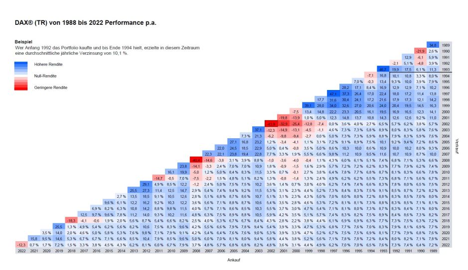 Dennoch kann sich die Performance des Aktienindex für die heute 40 wichtigsten deutschen börsennotierten Unternehmen durchaus sehen lassen. Das DAX-Rendite-Dreieck zeigt (siehe unten), dass sich in den vergangenen 35 Jahren ein breit gestreutes und langfristiges Sparen in Deutschlands-Top-Aktien ausgezahlt hat. Wer in Aktien des DAX investiert hat, partizipierte an der Kursentwicklung und den Dividenden der großen deutschen Börsenwerte. Knapp acht Prozent Rendite per anno seit seiner Gründung haben den DAX unter den Anlegern beliebt gemacht. Eine Wertentwicklung übrigens, die an den MSCI World heranreicht. Und ebenfalls augenfällig: Wer länger am Ball blieb, konnte herbe Verlustphasen wie etwa um die Jahrtausendwende nach einigen Jahren immer wieder ausgleichen.
