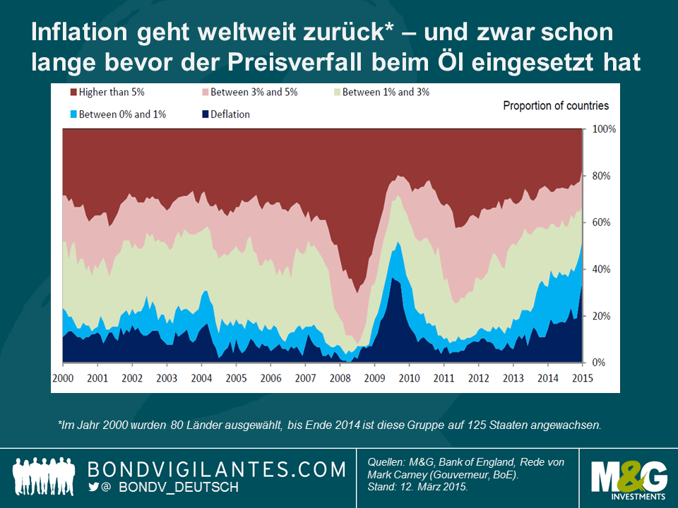 Bevor wir uns speziell mit China beschäftigen, müssen wir im Zusammenhang mit der globalen Inflationstendenz zunächst einmal darauf eingehen, dass die Teuerungsraten weltweit – wie ja jeder weiß – zuletzt deutlich gesunken sind. Diese Entwicklung hat sich seit dem Einbruch der Rohstoffpreise im letzten Sommer zwar noch beschleunigt, doch der Abwärtstrend bei der Inflation hat bereits lange vorher eingesetzt. Dies geht auch ganz eindeutig aus einer Grafik hervor, die der Gouverneur der Bank of England, Mark Carney, bei einer Rede im letzten Monat verwendet hat (nachfolgend haben wir diese Grafik reproduziert).