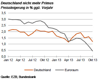 Hier kommt der dritte Grund für die geringe Geldentwertung ins Spiel. Es ist die Preisentwicklung in den Peripherieländern des Euroraums. In Griechenland gingen die Preise im September (neuere Zahlen liegen noch nicht vor) um 1 % zurück, in Irland lagen sie auf Vorjahresniveau, in Portugal stiegen sie gerade mal um 0,3 %, in Spanien um 0,5 %. Das drückt die Gesamtrate im Euroraum. Im Euroraum ohne Deutschland gerechnet, stiegen die Preise im Oktober lediglich um 0,4 % (jeweils gegenüber Vorjahr) verglichen mit 1,2 % in Deutschland. Deutschland ist nicht mehr Primus bei der Stabilität.