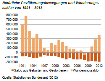 Wo sich die Lage jedoch verändert hat, ist bei den Wanderungen. Im Jahr 2012 sind per Saldo rund 400.000 Menschen aus dem Ausland nach Deutschland gezogen. So viel waren es seit den Jahren der Wiederverei-nigung nicht mehr (als es die hohen Zuzüge aus Russ-land und Osteuropa gab).
