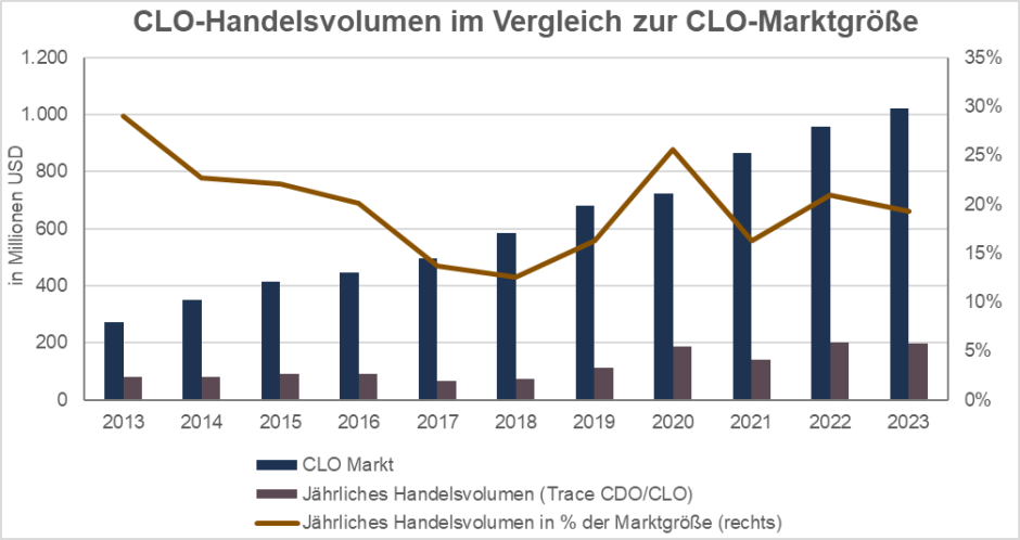 Der CLO-Markt hat ein Gesamtvolumen von 1.217,09 Milliarden (Stand: 15.August 2024) und ist ein etablierter Markt. Der CLO-Markt ist mit etwa 70 Prozent des gesamten Kredituniversums der größte Investor auf dem Kreditmarkt. Die Zunahme der Marktgröße, neue Marktteilnehmer und damit ein vielfältigeres Anlegeruniversum führen zu einer erhöhten Liquidität im CLO-Markt, insbesondere im Hinblick auf die CLO-AAA-Tranche. Angesichts der steigenden Liquidität des CLO-Marktes kann festgestellt werden, dass CLO zunehmend geeignet sind für liquidere Produkte wie beispielsweise ETFs und UCITS-Fonds.
