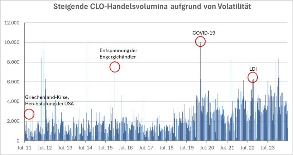 Das CLO-Handelsvolumen seit Jahresbeginn 2024 beträgt 135 Milliarden US-Dollar (Stand: 13. August 2024), ein Anstieg von 16,1 Prozent gegenüber 116,2 Milliarden US-Dollar im Vorjahr. 76 Prozent der gehandelten Transaktionen betrafen Tranchen mit Investment-Grade-Rating, die restlichen 24 Prozent entfielen auf Non-Investment-Grade-Tranchen. Der CLO-Markt ist zunehmend liquide geworden und verzeichnete in den letzten 12 Monaten ein durchschnittliches monatliches Handelsvolumen von 17,9 Milliarden US-Dollar.