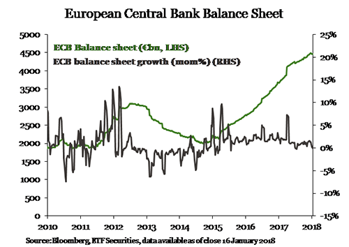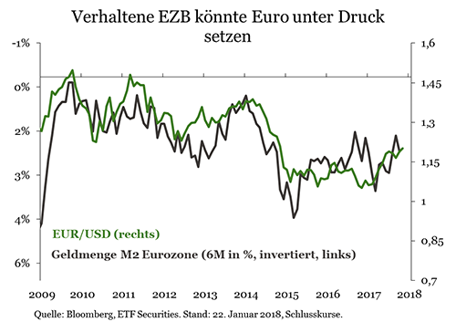 Auch das Wachstum der Geldmenge lässt nach. Trotzdem scheint der Markt die Möglichkeit einer geldpolitischen Straffung in der Eurozone bereits einzupreisen, und das trotz der Tatsache, dass die EZB ihre Inflationsprognose erst im Dezember zurückgenommen hat, weil laut EZB-Vizepräsident Constancio „die Löhne immer noch nicht ausreichend gestiegen sind“.
