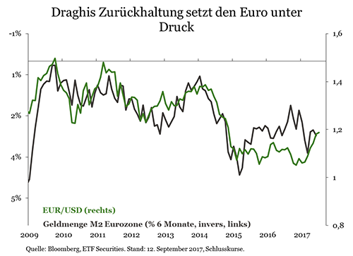 Mit den übermäßig optimistischen Wechselkursen täuscht sich der Markt nach unserer Überzeugung in der vorsichtigen Haltung der EZB. Die Notenbankpolitik war in der Vergangenheit stets konservativ ausgerichtet. Die EZB war immer sorgfältig darauf bedacht, den Markt nicht zu erschrecken. Draghis ausgewogene Kommentare deuten darauf hin, dass die Anreize noch einige Zeit bestehen bleiben und dass der Markt, der mit der baldigen Beendigung der quantitativen Lockerung rechnet, enttäuscht wird. Wir sind der Auffassung, dass die Stärke des Euro in Gefahr ist, da die EZB an ihren konservativen geldpolitischen Vorgaben nichts geändert hat.