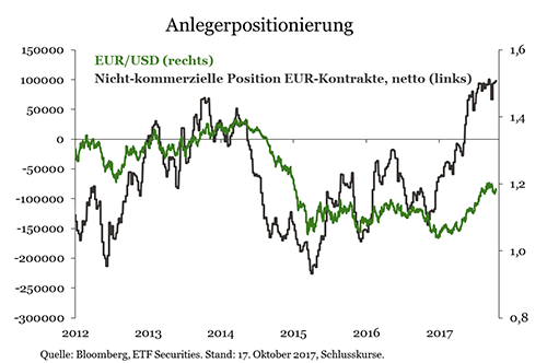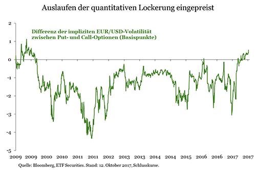 Im Vergleich zum langfristigen Durchschnitt ist die Euro-Positionierung auf den Terminmärkten gegenüber dem US-Dollar und dem Pfund Sterling weiter überzogen. Auch aus den Kursen auf dem Optionsmarkt geht hervor, dass nicht nur das Auslaufen der quantitativen Geldpolitik eingepreist ist, sondern auch, dass die Anleger hinsichtlich des wirtschaftlichen Hintergrunds nach wie vor optimistisch sind, da sich die Optionskurse auf dem höchsten Stand seit 2009 befinden. Es hat den Anschein, als würden Maßnahmen der EZB eingepreist werden, zu denen es auf kurze Sicht nicht kommen kann, so etwa eine heftige Debatte über den Bilanzabbau.