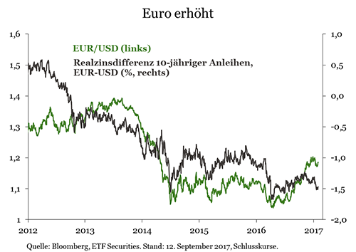 Der Euro legte in diesem Jahr bisher 12 Prozent zu, sodass er von den G10-Währungen gegenüber dem US-Dollar am zweitbesten abschnitt. Die Konsenserwartungen für den Euro liegen für das Jahresende 2017 bei 1,18 zum US-Dollar und bei rund 0,91 zum Pfund, was weiteren Zugewinnen von 0,4 Prozent beziehungsweise 2,8 Prozent entspricht. Wir halten die Konsenserwartungen für übermäßig optimistisch.