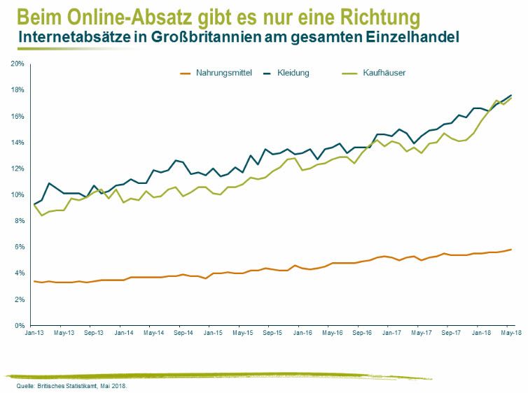 Neue und ältere Generationen kaufen mehr als je zuvor online ein: Die erwarteten Einnahmen von Amazon für das Jahr 2018 sind dreimal so hoch wie vor fünf Jahren, da das Wachstum des globalen Internetabsatzes eine Einbahnstraße zu sein scheint. Die Entwicklung des digitalen Einkaufens könnte zu einigen Insolvenzen und Umstrukturierungen führen und Einzelhändler dazu zwingen, Verkaufsflächen zu reduzieren und ihr Online-Angebot zu verbessern, damit sie überleben können.