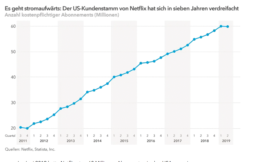 Im Juni 2019 hatte Netflix etwa 60 Millionen Abonnenten in den USA, was einer Verdreifachung der Gesamtzahl im Jahr 2011 entspricht. Weltweit steigt die Zahl auf fast 150 Millionen in Dutzenden von Märkten. Das Wettbewerbsumfeld könnte sich später in diesem Jahr erneut verändern, wenn Apple und The Walt Disney Company ihre eigenen Plattformen vorstellen. Die früheren Markteintritte könnten sich jedoch als bedeutender Vorsprung herausstellen, sagt Barrett.