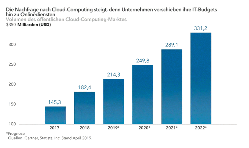 Die Cloud ist ein riesiges Netzwerk von Servern, das Benutzern den Fernzugriff auf Speicherplatz und Rechenleistung über das Internet ermöglicht. Mit anderen Worten: Anstatt große Investitionen in die eigene IT-Infrastruktur zu tätigen, können Unternehmen über die Cloud zu einem Bruchteil der Kosten auf Daten und Softwareanwendungen zugreifen. Laut Zahlen des Branchenforschungsunternehmens Gartner könnten die Gesamtausgaben auf dem Markt für öffentliches Cloud-Computing nach 145 Milliarden US-Dollar im Jahr 2017 im Jahr 2022 331 Milliarden US-Dollar erreichen.