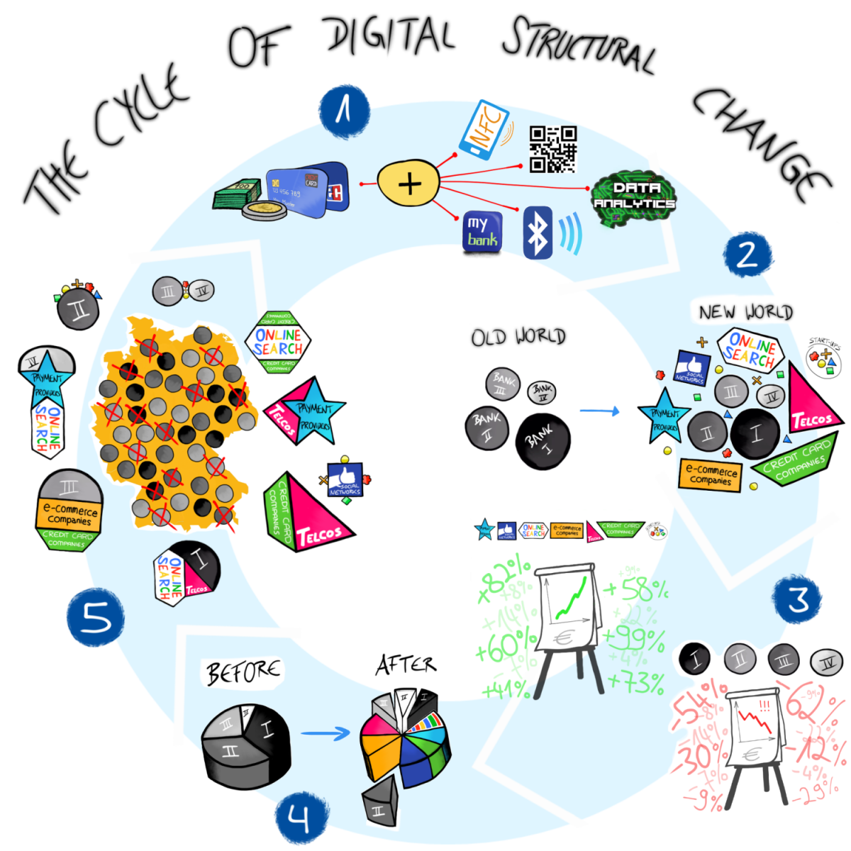 Die beschriebenen fünf Phasen des digitalen Strukturwandels im Finanzsektor können zeitversetzt in verschiedenen Branchen beobachtet werden und sich innerhalb einer Branche oder in immer mehr Teilprozessen der Wertschöpfung in gewissen Zeitzyklen sogar wiederholen. Das Ergebnis ist ein Kreislauf. Je nachdem, wie bahnbrechend der technologische Fortschritt ist und welche Strategien von den Etablierten eingesetzt werden, wirken die einzelnen Phasen natürlich in unterschiedlicher Intensität.