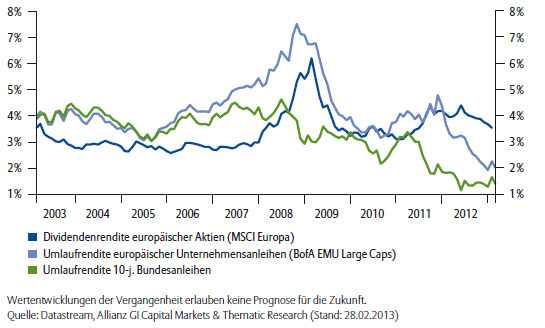 Dividendenstrategien vereinten die Qualitäten von aktuell hohen Dividendenrenditen und historisch niedrigen Kursvolatilitäten. Gleichzeitig böten sie Inflationsschutz. „So war die Diskrepanz zwischen den Dividendenrenditen und den Renditen von Unternehmensanleihen zumindest für europäische Unternehmen noch nie so hoch wie heute“, so der Autor. Insbesondere europäische Unternehmen zeigten sich ausschüttungsfreundlich: Ende Februar 2013 habe deren Dividendenrendite marktweit bei durchschnittlich 3,5 Prozent gelegen (Basis: MSCI Europa).