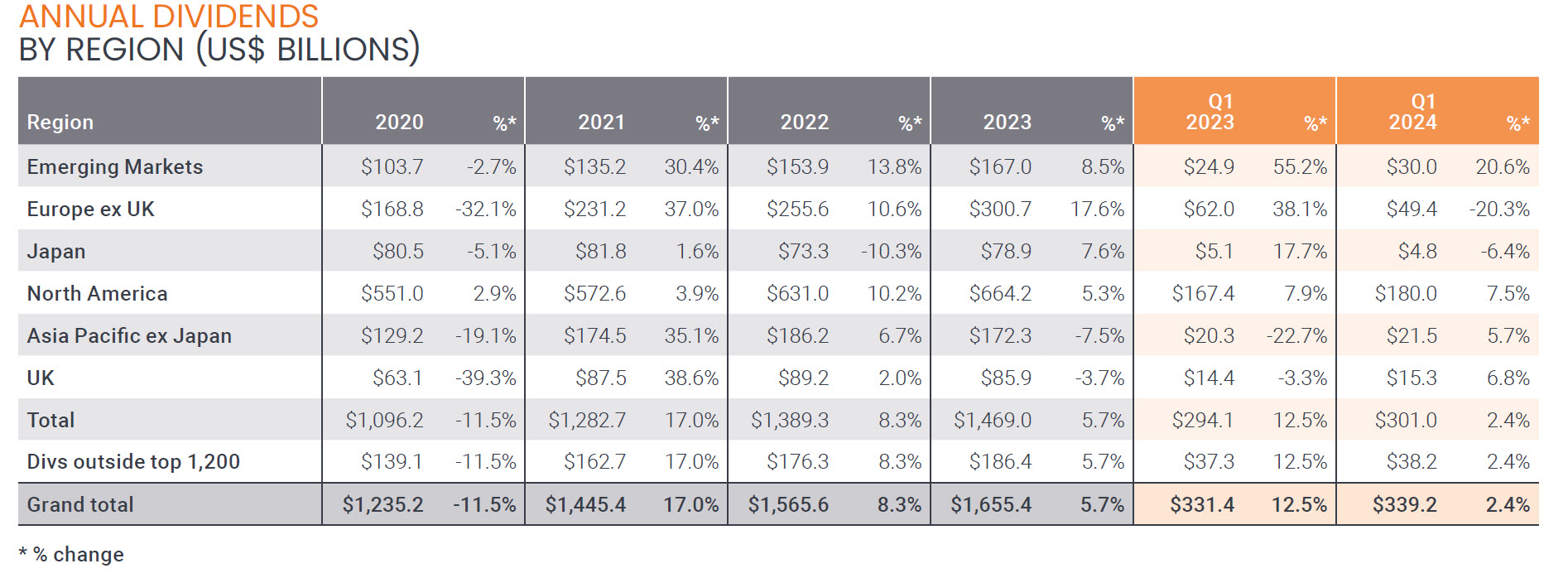 Das hohe bereinigte Wachstum von 6,8 Prozent war ausschlaggebend für diese Entwicklung, auch wenn der Gesamtbetrag aufgrund geringerer einmaliger Sonderdividenden langsamer (2,4 Prozent) anstieg. Im Vergleich zu den meisten früheren ersten Quartalen waren die Sonderdividenden immer noch relativ hoch – der Rückgang in diesem Jahr war lediglich auf eine außergewöhnlich hohe Zahl im ersten Quartal 2023 zurückzuführen, die nur von zwei Unternehmen geprägt war.