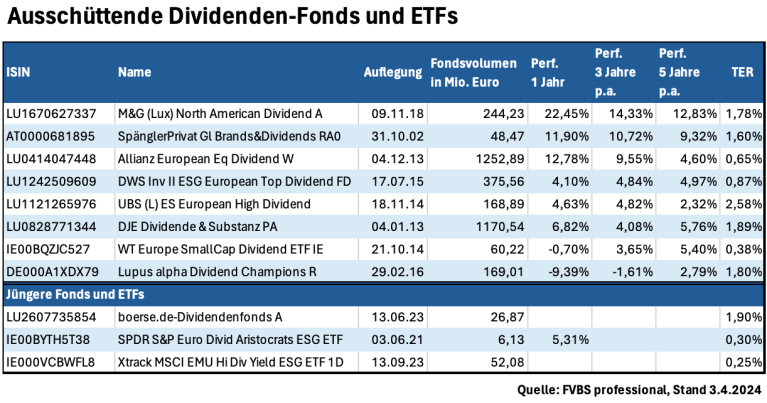 Auch im aktuellen Jahr dürfen sich Dividendenjäger, die auf den DAX setzen, freuen. Mit 52,3 Milliarden Euro werden die 40 Dax-Konzerne in diesem Jahr so viel an ihre Aktionäre ausschütten wie noch nie. Allerdings sollten Anleger diesmal die Höhe der Ausschüttungen kritisch sehen. Denn mit einem Nettogewinn von 102 Milliarden Euro haben die Dax-Konzerne 2023 rund 15 Prozent weniger verdient als im Jahr davor. Ob der DAX seine Rekordfahrt der vergangenen Monate vor diesem Hintergrund weiter fortsetzen wird, wird sich also noch zeigen müssen. Allein auf den DAX sollten sich Anleger, die auf Dividenden-ETFs setzen, deshalb nicht verlassen. Die gute Nachricht lautet: Es gibt Alternativen. Was aber nicht heißt, dass jede Dividenden-Strategie gleich gut ist. Investoren sollten sehr gut die Leistungen der verschiedenen Fonds und ETFs miteinander vergleichen. Die Tabelle, erstellt mit dem Analysetool FVBS Professional und sortiert nach der besten Dreijahres-Performance, macht deutlich, wie groß die Unterschiede bei Dividenden-Strategien sein können.