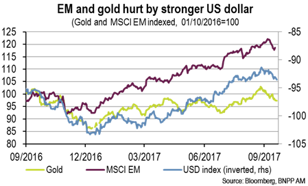 Several months of negotiations will likely be needed for the details to be agreed on and any tax cuts will be implemented. Still, the outlines caused the US dollar to strengthen and the yield curve to steepen, which supported shares in US small caps and financials. US Federal Reserve chair Yellen commented on inflation, indicating the Fed would look through recently weak numbers and stick to the path of monetary policy normalisation, pushing Treasury yields higher. This environment hurt emerging market stocks as well as gold, making them this week’s main underperformers.